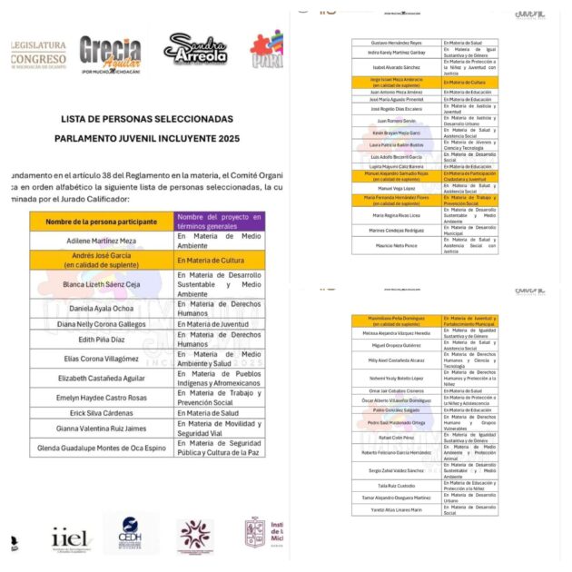 Morelia, Michoacán, a 18 de octubre de 2025.- Tras reconocer la participación de las y los jóvenes, la diputada Grecia Jennifer Aguilar Mercado, presidenta del Comité Organizador del Parlamento Juvenil Incluyente 2025, dio a conocer la lista de las y los seleccionados que formarán parte de este importante ejercicio de participación democrática, incluyente y transformadora.