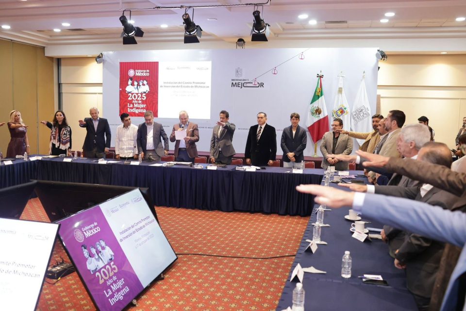 Morelia, Michoacán, 17 de octubre de 2025.-El gobernador Alfredo Ramírez Bedolla instaló y tomó protesta a los integrantes del Comité Promotor de Inversiones de Michoacán, quienes aprobaron firmar y enviar a la presidenta Claudia Sheinbaum Pardo, un pronunciamiento para mostrar respaldo del sector productivo y empresarial a su política económica y a las negociaciones que vendrán del nuevo Tratado entre México, Estados Unidos y Canadá (T-MEC) en 2026.
